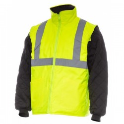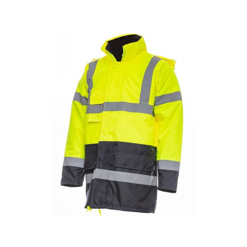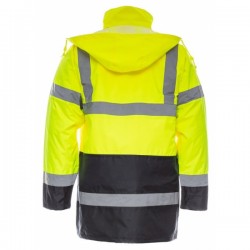 - Jachetă 3 în 1 Poly Oxford Yellow de semnalizare, impermeabilă, multifuncțională 3 in 1 (scurtă impermeabilă, vestă matlasată, mâneci detașabile la vestă), cu glugă, ascunsă în guler, închidere cu fermoar și capse);